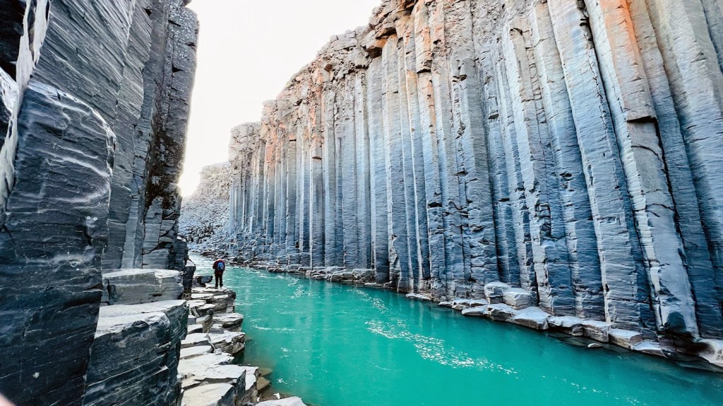 - Stuðlagil Kanyonu: İşte İzlanda gezisinin bir diğer yıldızı, bu kanyon. Gidişi biraz zahmetli, o yüzden dikkatlice okuduktan sonra yola çıkın. Öncelikle Google Maps’e Studlagil (East side parking) yazıyoruz ve buraya geliyoruz. Hemen park etmiyoruz (park edenleri görseniz de yanılmayın). Sonra bir köprüyü arabayla geçin ve sağa dönün ve taşlı çamurlu bir yoldan devam edin. Sonra ikinci bir otopark göreceksiniz. İşte bu park alanına park edin. Park alanından yaklaşık yarım saat kadar da dümdüz çayırlardan yürüyün. En sonunda kanyonun yanına geleceksiniz. Kanyonun içine de inebiliyorsunuz.